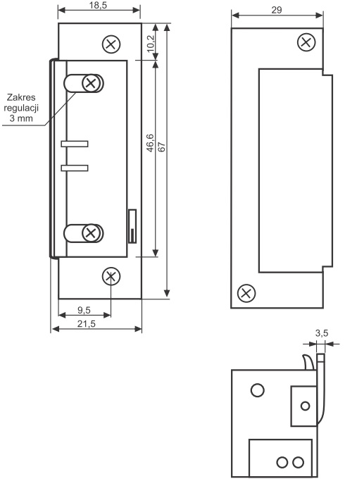 Umożliwia to montaż elektrozaczepu bez podcinania ościeżnicy od czoła drzwi i sprawia, że same drzwi są bardziej szczelne. Odpowiednie dopasowanie zaczepu ułatwia dodatkowo możliwość regulacji języka rygla w zakresie 3 mm. Śruby montażowe rozmieszczone są w odległości 52 mm od siebie.