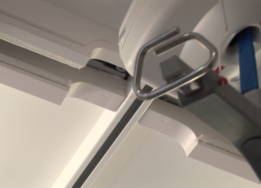 Specjalna stryktura prowadnicy z górną belką umożliwia w tym samym czasie zamykania skrzydła płynny przesuw podnośnika.